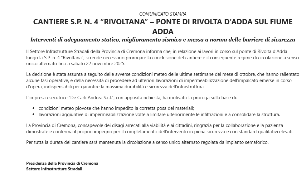La Provincia di Cremona – Settore Infrastrutture Stradali, Appalti, Porto, Trasporti, Protezione Civile informa che i lavori di manutenzione straordinaria attualmente in corso sul ponte del fiume Adda sono stati prorogati fino al giorno 22 novembre 2025.