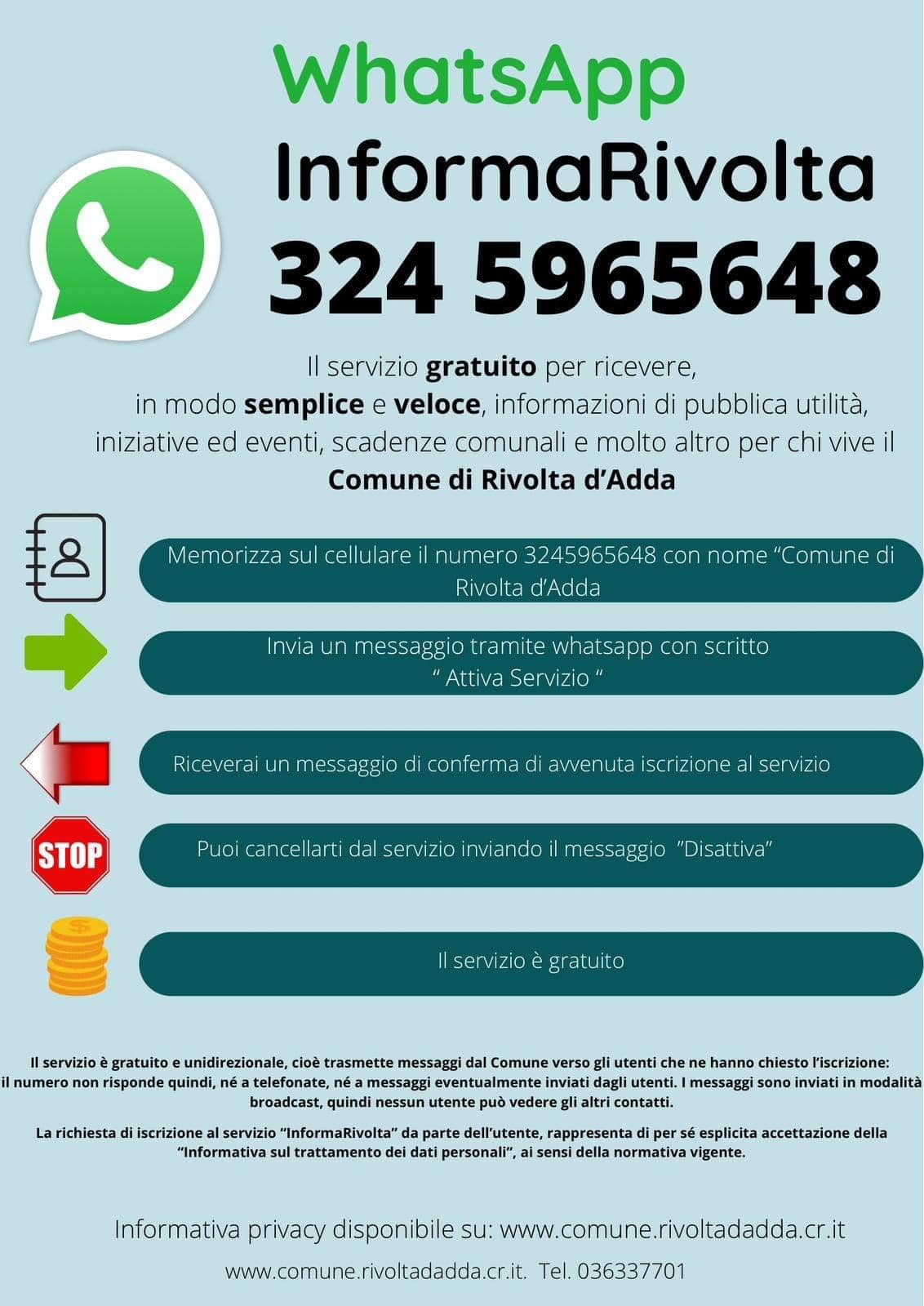 Se non siete ancora iscritti, salvate il numero 324 5965648 con il nome di “ Comune di Rivolta d'Adda” e mandate un messaggio whatsapp con scritto “Attiva servizio”.